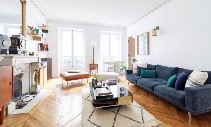 The old apartment has been beautifully renovated, with parquet flooring, moldings in every room and a marble fireplace.