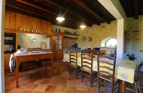 * The country kitchen is also very spacious and very well equipped. There are a dining table and chairs to seat up to 10 guests and armchairs to relax in another log burner. French doors open onto the garden.