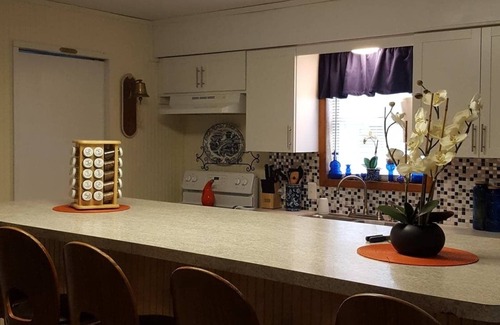 This cottage sleeps 8, has a full kitchen with 6 bar stools and a dining table for 3. The living room features seating for 7 and a 42 inch television, equipped with Dish TV.