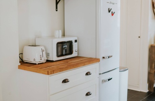 The galley style kitchen is equipped with many of your basic cooking essentials.