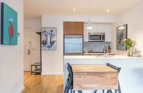 Welcome to Magnolia Manor, a contemporary condo in the tranquil Park Slope neighborhood, adjacent to Prospect Park. This fully equipped home features ultra-fast WiFi, abundant natural light, and a seamless flow from the spacious living room to the open-plan kitchen. The living area doubles as a functional workspace with dual-mounted monitors (cables not provided) and a smart TV for streaming. The serene bedroom offers a queen-sized bed, generous closet space, and electronic window shades, complementing the sleeper sofa in the living room for additional guests. Step out onto the quiet patio, the perfect spot for relaxation.