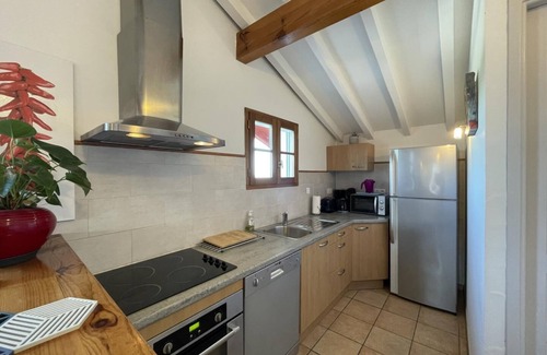 Pretty gîte on the first floor of the owners' house at the back of the house. Large living room divided into an equipped kitchen area (ceramic hob, microwave, fridge-freezer), a dining area and a lounge area (stove), 1 large bedroom (1 bed 160), 1 shower room/wc. Storeroom. Reversible heating, air conditioning at an additional cost. Wood at an additional cost (€2 per basket). Free Wi-Fi access. Bed made on arrival. Towels can be rented. Parking, open shared courtyard, shared garden with a view of the village. Terrace. Garden furniture, barbecue. Many hiking trails from the gîte and the village (follow the markings). Farm nearby (sheep, cows). Listed village of Ainhoa 1 km away.
