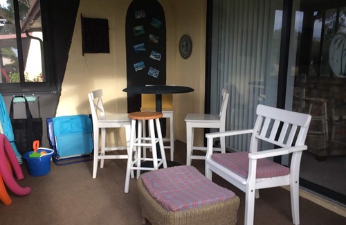 Comfortable lanai with sliding windows allow enclosed or open-air room with views of tennis courts, large heated community pool, and beautiful landscaping. One guest in your party must be 55 or older. Others o-kay to be under 55 years old.