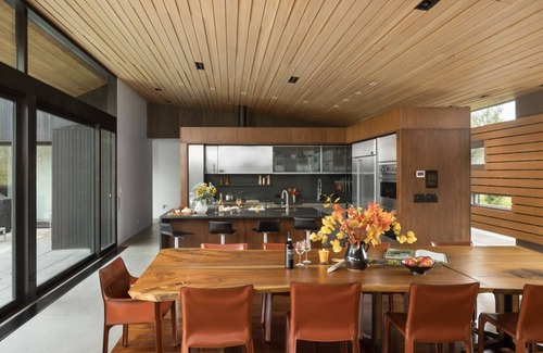 The long, clean lines of the main house and guest house are the very essence of flow and function: one simple, airy, light-filled space opening to the next, each one exquisite and perfectly suited for its use. The entry hall leads into the sweeping kitchen, dining and living areas, anchored at the far end by an angular wood-burning fireplace. Rich, warm hues of leather, maple and garnet confer warmth and intimacy, while the great wall of glass running the length of the space opens this luxury Jackson Hole rental home to the staggering landscape outside.