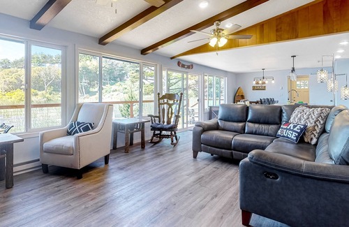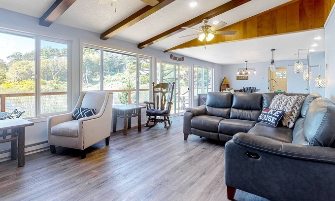 Take a break from it all and ease into the slow lifestyle of Port Orford. Comprised of a main house and studio suite, this getaway boasts a picturesque location right on the water with a private dock, hot tub, a large deck, and views from nearly every room! The interior of this getaway offers coastal charm that will invite each guest with vaulted ceilings, modern furnishings, and an open layout that is perfect for entertaining the whole gang with ease. When you want to whip up a tasty snack or gourmet meal, the full kitchen is equipped with stainless steel appliances, wonderful countertops, and an island with bar seating to make meal prep a social event. For those who choose to claim the studio, the kitchenette awaits with a hot plate, mini-fridge, and microwave for preparing snacks, and a mounted flatscreen TV for entertainment. Plus, no one will have to be disconnected on this vacation, as free WiFi and a flatscreen TV await for sharing memories on social media, catching up on emails while away, or streaming favorite movies as the stars come out!
