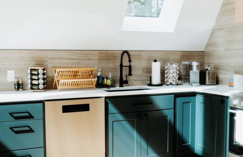 This cozy 1,100 square foot space was completed in the summer of 2024 and comfortably accommodates up to four guests in two bedrooms (a cozy Queen bedroom downstairs with a tv and a spacious King bedroom in the loft) plus one shared bathroom. To reach the loft, you’ll need to climb a narrow spiral metal staircase. This room boasts the best lighting and is one of my favorite spots to relax.
