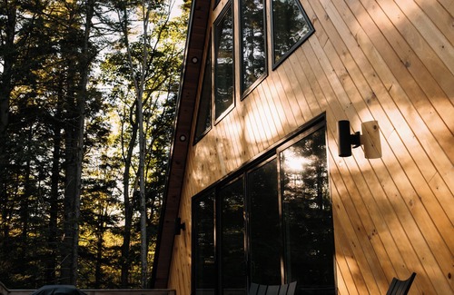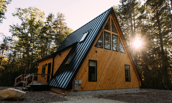 Welcome to The Maine Frame! Perfect for small families or couples, our signature A-Frame cabin features a modern gas burning fireplace, soaring ceilings, huge windows, stylish interiors, and all the comforts of home.