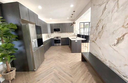 This home was expertly designed, including high-end gourmet kitchen featuring European style soft-close cabinetry, LG INSTAVIEW stainless steel appliances, marble countertop and backsplash with antique gold finishes throughout. Character rich accent walls — IG ready.
