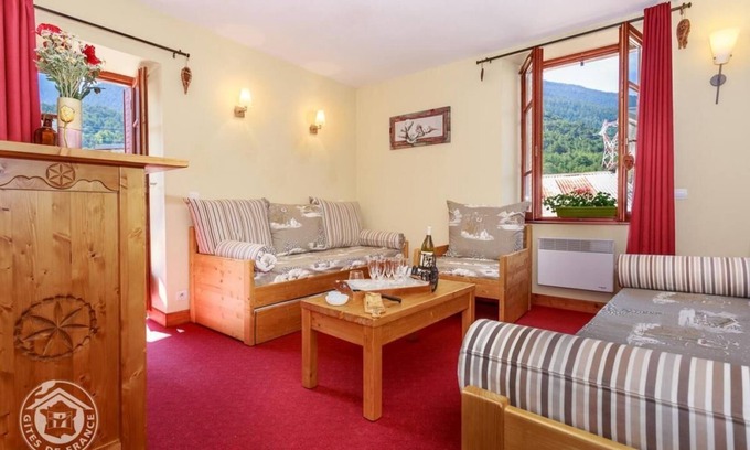 Gite in terraced house, village, on 3 levels. Ground floor: 1 room with access from the outside and accessible for person with reduced mobility (1 bed 2 persons 160 x 200, 1 person bed), bathroom (shower, WC). 1st floor: 2 bedrooms (1 bed 2 persons 160 X 200 cm, 1 bed 1 person / 1 bed for 2 persons) with bathrooms each en suite (shower, WC). 2nd floor: living room-kitchen, living room with balcony (2 beds 1 person), Wifi connection. Bed linen + household linen included. Beds made. Tourist tax included. Public car park at 50 m. possibility to unload the car before the cottage. Terraced house in the heart of a village, 5 km from the ski slopes. Typical village is located at the gateway to the Vanoise Park. Cottage in a small pedestrian street very quiet. Very good comfort. Lots of charm. Pleasant mountain stamp with a very neat decor. Small balcony with mountain views.