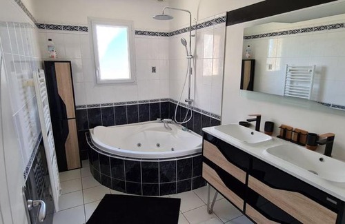 Boasting garden views, Maison Le Bernard offers accommodation with a garden, a terrace and barbecue facilities, around 22 km from Port Bourgenay Golf Club. Featuring free private parking, the holiday home is in an area where guests can engage in activities such as hiking and fishing. The holiday home is located on the ground floor and is fitted with 4 bedrooms, a flat-screen TV with satellite channels and a fully equipped kitchen that provides guests with a fridge, an oven, a washing machine, a dishwasher and a microwave. Towels and bed linen are featured in the holiday home. The holiday home offers a hot tub. Domangère Golf Course is 25 km from Maison Le Bernard. The nearest airport is La Rochelle - Ile de Re Airport, 67 km from the accommodation.