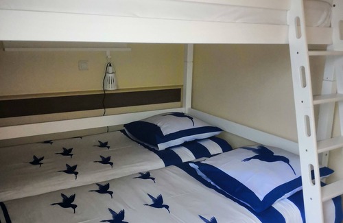 Upstairs, a master bedroom with a large wardrobe, a second bedroom with a 140X200 mezzanine bed (Emma mattress), and below 2 80X190 beds with bedside table and a closet.