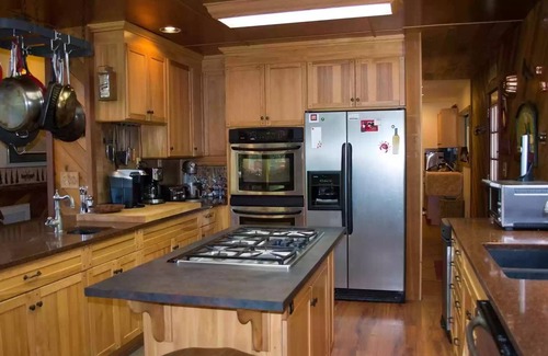 An oversize playroom is great for both kids and adults to hang out. It has access to the garage and a second – private – upstairs level. This level includes an open concept living space which combines a bedroom with a queen bed and a split-level loft with two twin beds, a living area with couches and a TV, a wood burning stove, and a full bathroom. You can also access the back balcony from this level. Oversized ceiling-high wall of windows offers one of the best views in the house. This level can also be privately accessed through a side door of the playroom, by-passing the main level of the house, which allows for great privacy for someone who wants it.