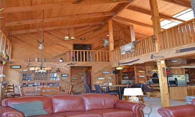 This property is on an acreage and features private lake access and breathtaking views. The outdoor features include an enormous wrap-around deck, a private dock with a boat house and an additional covered boat parking, a BBQ grill, a firepit, a dry sauna, a pond, a playground with swings, a solarium, and several private roads to hike around and explore. There is ample of parking on the grounds, a privacy gate, and multiple amazing indoor and outdoor spaces!