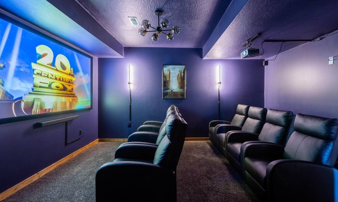 The cabin offers countless of amenities to keep everyone entertained. You will find an 8 person movie theater, a hot tub, grill, outdoor dining and seating areas, fireplace, fire pit, gameroom with pool table, shuffleboard and foosball table, and last but not least a half basketball court.