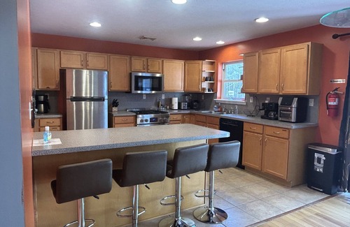 Our oversized eat-in kitchen is equipped with brand-new appliances. We are avid cooks and felt the need to have pots/pans/blenders/coffee maker/pantry essentials for you to enjoy. We provide complimentary coffee, tea, and sugar. There is also a formal dining area located next to the kitchen.