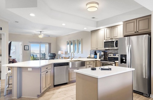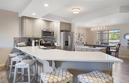 Steps away the kitchen comes equipped with stainless steel appliances and everything you may need to whip up delicious meals from home. Additional kitchenware such as a blender, toaster, and coffee maker are all available for your convenience. The extended counter is ideal for extra prep space and casual bites and offers counter seating. For more formal dining, head to the dining room where you can find a table for 7.