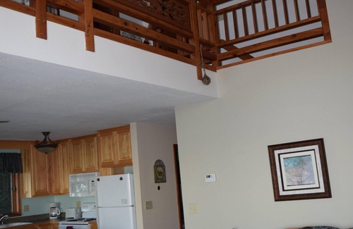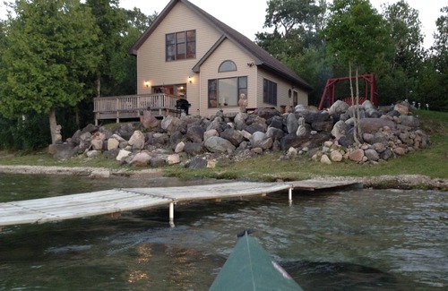 Designed for socializing, the open living room, dining room and kitchen area provide the perfect location for family gatherings. On a warm summer's evening, continue the merriment outside on the spacious front deck. As the sun sets, enjoy s'mores at the campfire as you listen to the loon's evening call. The stone filled beach front will provide hours of entertainment for avid rock-skippers in the group.