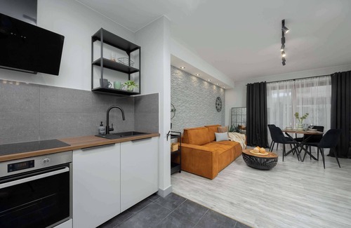 The spacious ground floor apartment is an excellent choice for families and groups travelling together. The interior is decorated in a bright, modern style with elegant accents that give it a unique character. The bedroom has a double bed, providing a comfortable place to rest, while the living room has a double sofa bed, creating additional sleeping space. The kitchenette is fully equipped, which allows you to prepare meals yourself. Guests have at their disposal an induction hob, oven and dishwasher, which make the cooking process easier. Directly from the living room there is an exit to the furnished terrace with a garden, which is an ideal place to relax with morning coffee or an evening meal outdoors. The bathroom has a shower, and soft towels and a special set of free cosmetics have been prepared for guests. During longer stays, the washing machine in the apartment will be a great convenience. The bedroom has a separate area for remote work, where a desk and a comfortable chair allow you to comfortably perform your professional duties. There is a fast WiFi connection available in all rooms, and an additional multimedia convenience is a flat-screen TV with SmartTV+ function, allowing you to use streaming platforms. The property is pet-friendly, which allows you to travel together with your four-legged companions. Guests also have a parking space in the underground garage at their disposal.