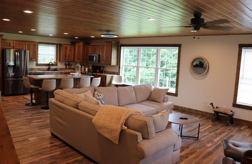 Relax and enjoy the views either on your porch, or at the common area Pavilion. Enjoy our PRIVATE playground, swimming, fishing, hiking, kayaking, or going to our private cave and waterfall. Beautiful privacy tucked nicely in a corner. Pavillion and playground can be seen from front porch. Enjoy the country atmosphere and set on your back deck facing the woods and enjoy the peace and quiet and tranquility.