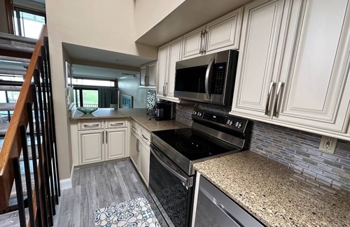 Enjoy spectacular gulf views, year round tropical weatherand sunsets from this gulf front Manasota Key villa. Manasota Key, located south of Sarasota,is a hidden gem on the gulf coast of Florida. It is quiet and laid back, ideal for guests that want to avoid the crowded beaches.This is a two bedroom two bath end unit with soaring vaulted ceilings and an abundance of natural light.Wake up to sweeping gulf views in the master suite. The master suite has king bed andincludes a private renovatedbathroom and walk in closet.Have your coffee on the private lanai, just off the master. The large, second bedroom includes a twoqueen beds andhas a vaulted ceiling, large windows with an updated bathroom. The kitchen features granite countertops, new backsplash,new stainless steel appliancesand is fully furnished with high quality dish andcookware.A heated community pool is available just steps from the villa.There is a washer and dryer and storage closet full of beach items for you to use, along with a BBQ grilll. Kayaks and bikes may be used with a signed waiver. Covered parking under the villa. Hang out at the beach, take a dip in the gulf, and have lunch or dinner at one of the restaurants on the key. End your day with a spectacular sunset at the beach or your private lanai. Look for the elusive "green flash."