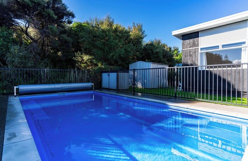 Yes, this Mangawhai Heads house has a swimming pool. Check the Facility Overview section for details about the pool and other available facilities.