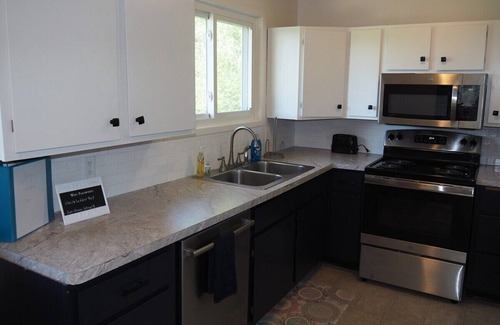 The living room features new, cozy, and very comfortable furniture and a fantastic view of Manistee Lake via big bay windows. The living room also has a new electric fireplace and a new big screen smart television with live-streaming built-in. Both Netflix and PureFlix are provided free of charge with the rental and guests are welcome to load their own channels / apps on the smart tv for viewing as desired. High-speed Wi-Fi is included with the rental. The cottage has both heat as well as air-conditioning to keep guests comfortable whatever the weather may bring. The cottage also comes with a new washer and dryer!