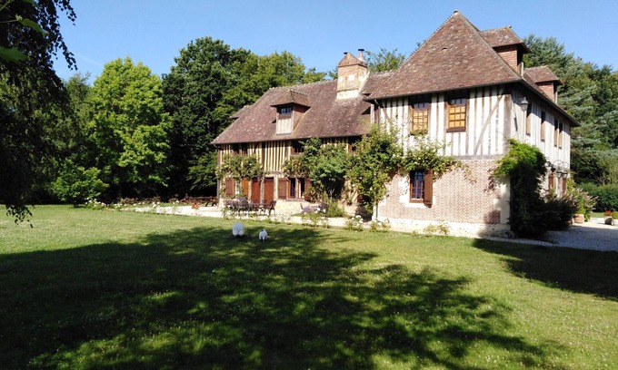 "Le Manoir du Bocage" is located on a property of 8 hectares, dating back from 17th century, for 10 people. Nestled on the edge of a forest and a pond, this authentic, fully renovated in 2007, manor hosts you in a warm and stylish interior: floor tiles, fireplaces, panelling, and tiles. The place is favourable to discover the nature. Deauville is only 40 minutes away. You will find a kitchen, a dining room, a double living room with fireplace, 5 bedrooms, one of which is a duplex, a library, 2 shower rooms, and 1 bathroom with a spa bathtub/chromotherapy, and a hydromassage shower. Sheets and bathroom linen are provided. Rated "4 épis". Gite with character, "4 epis" charming gites, many consumer's reviews on TripAdvisor.