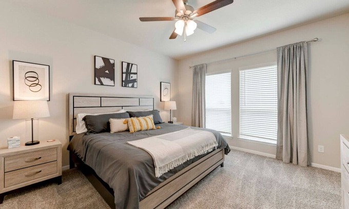 You'll have a great time at this comfortable place to stay. This modern 3-bedroom, 2-bathroom home features an open-concept layout with high ceilings and abundant natural light, creating a welcoming atmosphere for families or groups. The kitchen boasts quartz countertops and a spacious island, perfect for preparing meals and entertaining. The primary suite offers a walk-in closet and a luxurious en-suite bathroom, providing a private retreat. Located in a peaceful neighborhood, you're just a short drive from local parks, shopping centers, and dining options in Manor. With its blend of modern amenities and prime location, this home provides an ideal retreat for your stay.