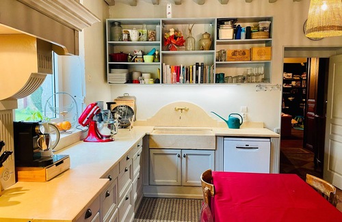 The garden and park cover one hectare, featuring century-old cedars, fruit trees, a barn with a ping-pong table, an unheated pool, a barbecue and plancha at your disposal, as well as several terraces for dining. Our manor house combines the charm of a small château with modern comfort. Formerly a hotel, it can accommodate large groups:
