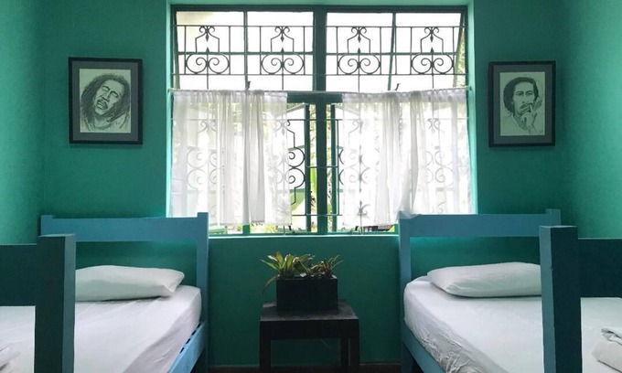 This private room is cozy and colorful with two twin beds. It has a ceiling fan and wall fan. The property has a huge garden with lots of seating areas. Restaurant and bar on property. Free wifi and parking.
