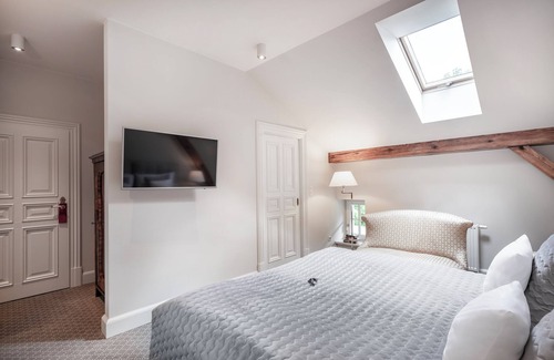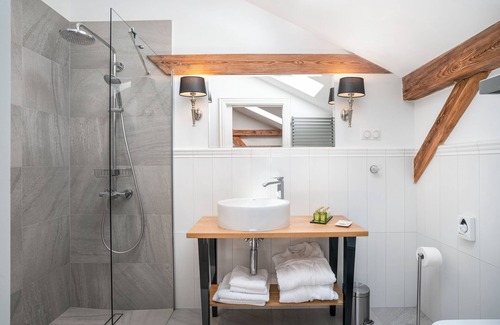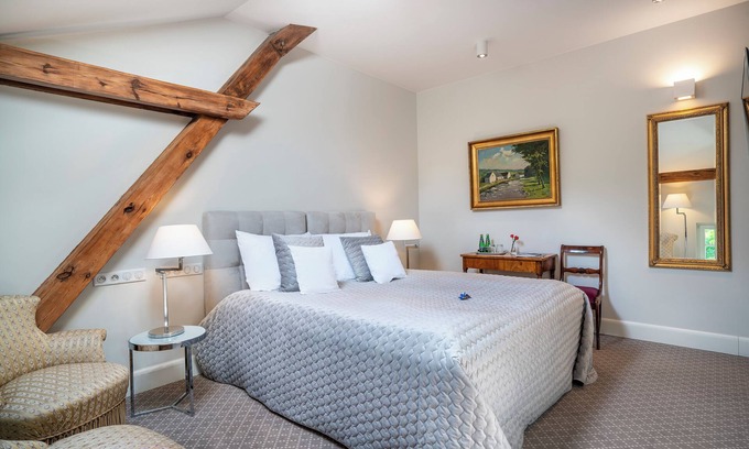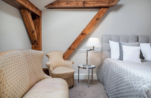 Situated on the second floor of the palace, this atmospheric double room is rich in modern comfort and historic period features like an antique wardrobe. The king-size bed can be double or twin. Because this room is at the very top of the palace, the light comes mainly through roof windows, as the windows in the walls are pretty small.