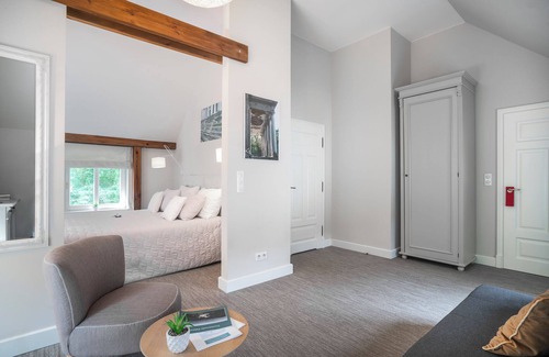 A spacious junior suite on the first floor of the historic annex to the palace building, with a garden view. The bedroom is composed of two rooms. In the main room, the king-size bed can be double or twin. In the other room, the sofa-bed can accommodate an additional one or two guests. Because part of that building was a stable, the interior is in the rustic style.