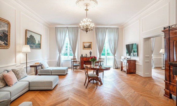Located on the first floor of the palace, this very large suite, called Sunny, consists of a bedroom and a living room with a balcony that makes the best of the garden views. The suite is beautifully appointed, historic and luxurious. It offers a sense of space and has a super-king-size bed, antique dressing table and comfortable contemporary sofa, as well as all our usual amenities, including an en-suite bathroom, TV, tea- and coffee-making facilities and complimentary Wi-Fi.