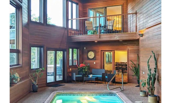 Tropical Oasis indoor Swimming pool: for soaking, playing, and laps. lounge area on the lower level and upper level. With a hot tub and gas firepit steps away outside. Access to the deck for sun tanning. 2 Sun Loungers can be used on either the basement level or main deck level.