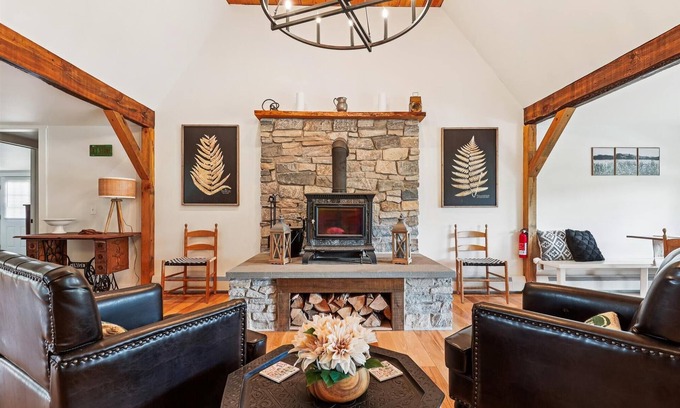 This unique Vermont barn-turned-home has been beautifully thought out and offers a warm welcome from the moment you enter. Rustic and modern elements blend smoothly throughout, and careful thought has been put into comfortable spaces and furnishings. Natural elements such as warm wood flooring and hand-hewn beams are found throughout the home. The open floor plan features a bright white kitchen with subway tile backsplash and all new appliances. An adjacent dining area features built in banquette seating and sliding door access to the deck. The raised wood stove providing warmth and ambiance is the focal point of the sitting area, while the TV and a plush and cozy couch beg for movie night in the living area.
