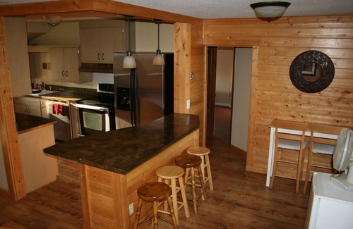 The cabin has a large dining area to accommodate many people plus a deck with table and chairs and a picnic table outside patio area. Gas and charcoal grill is provided.