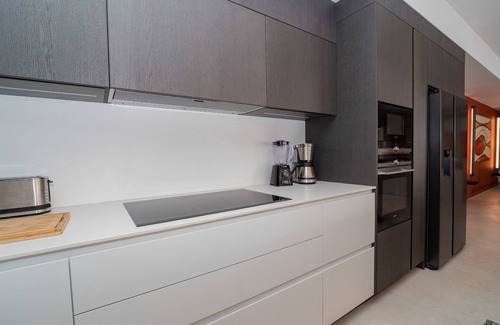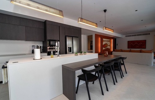 The living room is composed of comfortable sofas, linen and ochre-coloured armchairs, as well as a HDTV for pleasant movie nights. Modern and contemporary, this living space connects the well-equipped kitchen featuring a dining area. The setting is stylish, elegant and luxurious, in a chic and private atmosphere ideal for talking or simply relaxing.