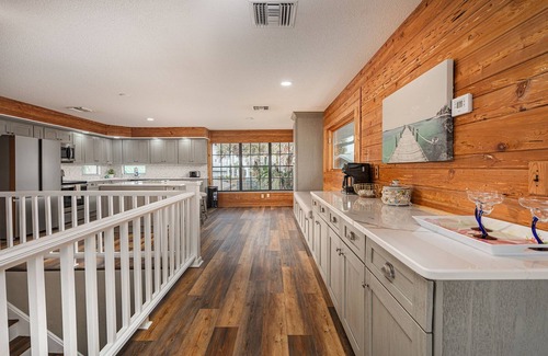The other side of the pool deck leads into the first floor of the main house. The remaining bedrooms are all on the first floor of the main house. The first guest bedroom features a queen bed, separate access to the pool deck, and an ensuite bathroom which includes a gorgeous, walk-in shower. The primary suite holds a king bed and ensuite bathroom. The ensuite primary bathroom features a garden tub, double vanity, and spacious, walk-in shower. Another guest bedroom holds a queen bed with an adjacent bathroom including a lovely, tiled walk-in shower. Also adjacent to this bathroom is the last bedroom and it's perfect for tiny travelers! It features two twin/full bunk beds and even includes two twin trundle beds allowing for up to 8 guests in just this bedroom.
