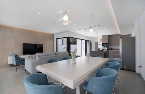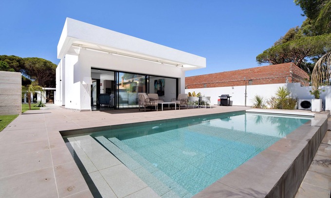 The luxurious and exclusive "Maria del Mar Sea Villa" is 200m from the coast and only 10 minutes drive (6 km) from the center of Chiclana de la Frontera. It also has a swimming pool. On its 2 floors and 200 m² of living space it consists of a living-dining room, a very well equipped open kitchen, 4 bedrooms (see room distribution below) and 4 bathrooms, so it can accommodate 8 people. Additional amenities of this design house include Wi-Fi, fitness equipment, air conditioning )(with heating function), washing machine, dryer and several TVs. In addition, if requested in advance a crib and high chair can be provided, making it perfect for people traveling with children. Through the sliding glass doors of the living room, which can be opened completely, you can go out to the unique outdoor area. There, a 24 m² infinity pool (that can be heated during the winter months for an additional daily fee), an outdoor shower, a comfortable seating area, a barbecue and sun loungers await you - everything you need for an unforgettable vacation. There are restaurants and supermarkets within 750 m and the nearest bus stop is 600 m from the accommodation. A short walk through a pine forest will lead you to Barrosa Beach (8 minutes walk; 700 m).