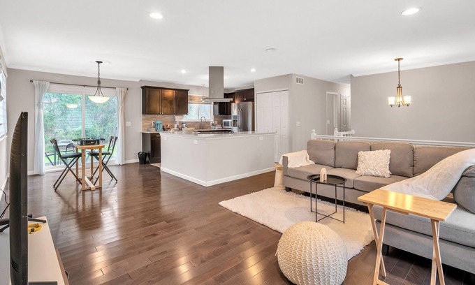 This beautiful luxurious house was renovated in 2017. It is located one mile from the lake close to the park. The beautiful location is surrounded by glamorous water front mansions. The house has 3 bedrooms with two queen sized beds, a twin bed and an air mattress in the basement that can act as a fourth bedroom. It also has an open space living area with full kitchen. It has appliances such as dish washer, washer and dryer, fridge, cooker, over, microwave. It also has a nest thermostat providing good air conditioning throughout the house. You will enjoy your stay.