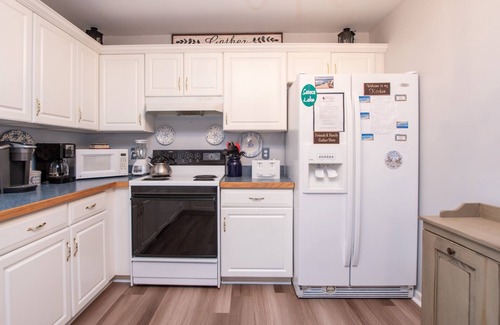 The three bedrooms upstairs provide sleeping space for 7 friends and/or family members. The spacious master bedroom has a full master bath with a stand-alone shower and tub - the tub is a contemporary oval shape, as well as its own elegant sitting room attached to it, overlooking the lake and furnished in white wicker, complete with cozy rocking chairs. The queen bed is made for restful nights, and a ceiling fan keeps the sleeping area comfortable during the warmer months.