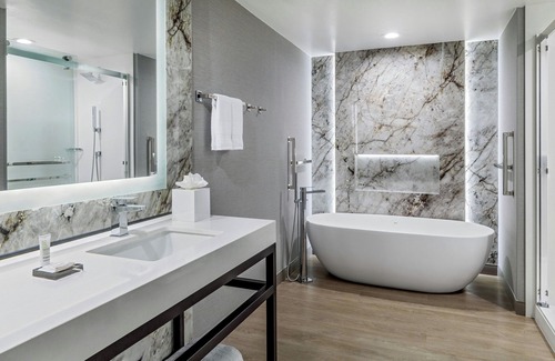 Marriott Denver Airport at Gateway Park offers 238 accommodations with iPod docking stations and MP3 docking stations. Beds feature down comforters. LCD televisions are featured in guestrooms. Rooms have partially open bathrooms. Bathrooms include shower/tub combinations, designer toiletries, complimentary toiletries, and hair dryers.