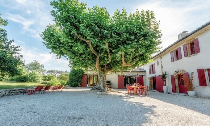 A Provencal farmhouse to rent for your holidays, the signature of a decorator.In the Drôme Provençale with the sound of cicadas, ideally located between Grignan and Vaison-la-RomaineU-shaped farmhouse in the middle of vineyards, surrounding a magnificent plane tree, very quiet on 3 acres of land.The land: an orchard, squares of flowers to cut, several islands of regional plants, 2 fields, 1 ha of vines and a very pure water source. The property is bordered by vineyards and is fully fenced.The living area is around 350m2, the storerooms around 100m2.In the west wing, a large living room of 100 m² comprising a fitted kitchen with cold room, dining room and lounge.The central building includes- on the ground floor: 1 entrance, 1 WC, 1 TV lounge/office, 1 linen room, 1 air-conditioned bedroom + SDR.- On the first floor, 1 dormitory with 2 140cm beds and a bathroom, 1 bedroom with a double bed and its bathroom, 2 smaller bedrooms with a double bed and 1 bedroom with two single beds, these 3 bedrooms are served by a large shared bathroom. The second wing includes a greenhouse and a wood store.The house is bordered by plots of vineyards and 2 fields to the south and north belonging to the property. Large heated swimming pool of 16m*4m secured by an electric shutter, technical room and semi-covered terrace on the edge of the pool.As it is an old mill, the property is bordered by a river, so it is not suitable for children who cannot swim.Note: a deposit of 1500€ (not cashed) is required, as well as an insurance for holiday extension.