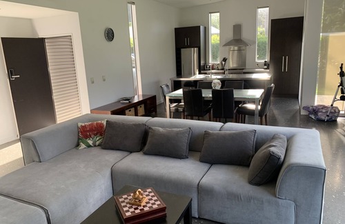 The designer kitchen is perfect for cooking and entertaining and has all the modern appliances that you need. We have a modern XL Webber Q gas BBQ. Nespresso machine(BYO capsules). There are two master bedrooms, one with double bi-folds which opens out onto the same deck that the kitchen and living areas open onto. The third bedroom is perfect for the kids. Bathroom has bath and shower. Toilet separate.