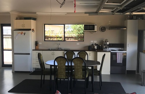 North facing open plan holiday home, great for relaxing with family and friends. 6 seater dining room table, bathroom with shower vanity toilet plus and extra separate toilet. Outdoor shower. Plenty of room for summer fun, outdoor deck with BBQ area, with outdoor drinks fridge. Large section that can be used for tents, outdoor games, easy off street parking. Quiet location. Very easy care as it has a concrete floor in main living area. The west facing wall is a large garage door that can be opened up all day to enjoy the outdoors.