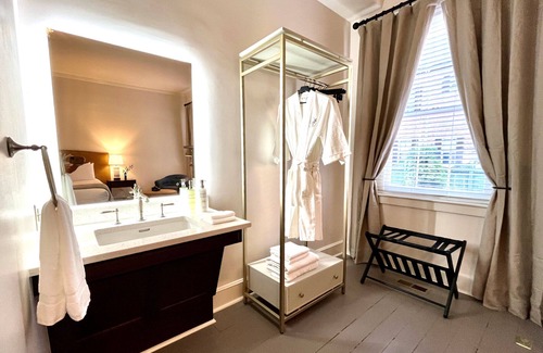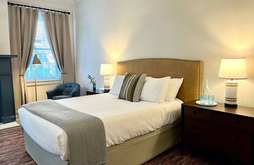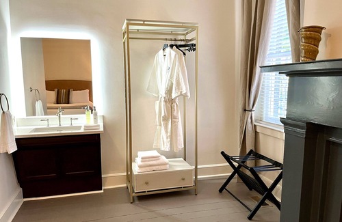 Located on the ground floor in an older part of the house, this quaint room is ADA accessible with queen bed, open shower concept, in-bedroom vanity, and comfortable reading chair. The historic blue of the mantle, accented by a marble tile hearth, flawlessly blends with the bold colors of a rag cloth rug.