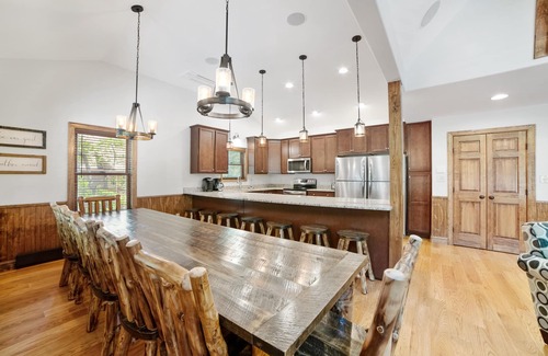 Relaxing and unwinding is easy in this beautiful lakeside home with 4,500 sq ft of living space. The great room is spacious and sunny with large windows overlooking the mature trees, high vaulted ceilings and solid hardwood floors and fittings adding warmth throughout. There is ample space to gather with friends and family with large sofas in front of fire, a separate sunny seating area and a stunning log dining table for memorable vacation meals. The modern kitchen is every chef's dream with high-end appliances, granite countertops, upscale amenities, and a granite bar counter with seating for six. Cooking for a large crowd is easy with two fridges, two dishwashers, two ovens and lots of workspace for prepping your home-cooked vacation meals.