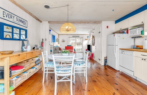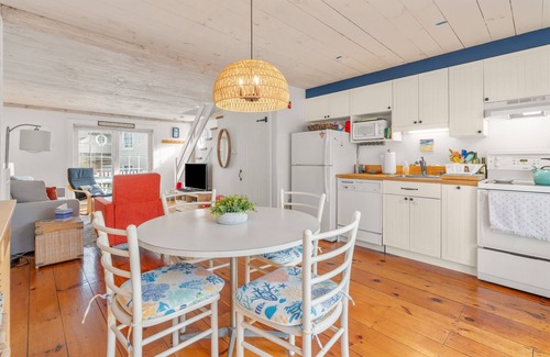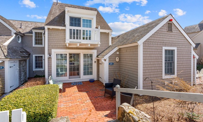 Located in the heart of Maushop Village, perched at one of the highest points where you get a peak of the ocean. Summer breezes are heavenly here. Enjoy your own private sandy beach at this quaint Nantucket style enclave. White picket fences, seashell drives, and window boxes with abundant hydrangeas, pink roses and red geraniums paint the quintessential Cape Cod scene! There are two bedrooms upstairs, one with a Juliet balcony. There is a brick patio area with grill for traditional cookouts. A large open kitchen, dining and living room with wide pine floors offer comfortable seating and everything to make your stay care free, casual, cozy and comfortable. Just a quick walk to Popponesset Marketplace (in-season) and the Popponesset Inn for fine dining, pizza shop, general store, ice cream, and live music. Great walking and biking area.