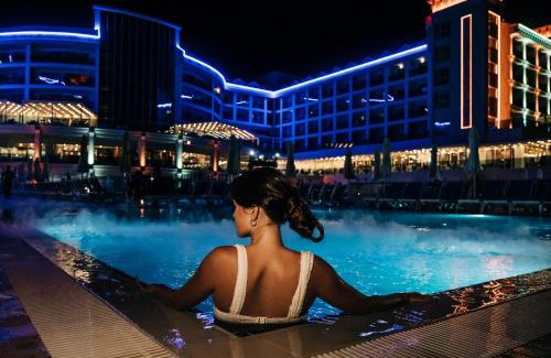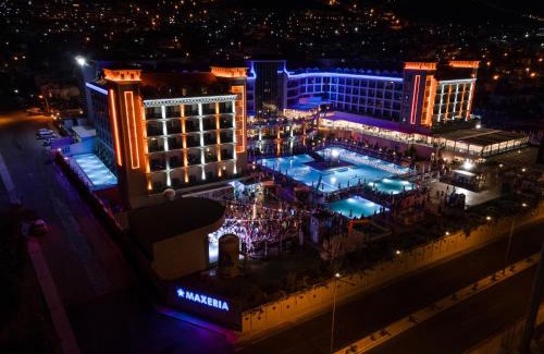 Located in Didim, 12 miles from Dolphin Square, Maxeria Blue Didyma has accommodations with a seasonal outdoor swimming pool, free private parking, a fitness center and a garden. Featuring a shared lounge, this property also welcomes guests with a restaurant, a water park and a terrace. The hotel has an indoor pool, sauna, karaoke and a kids' club. At the hotel rooms have air conditioning, a desk, a balcony with a city view, a shared bathroom, a flat-screen TV, bed linen and towels. Each room includes a safety deposit box and free WiFi, while certain rooms come with a sea view. The rooms will provide guests with a fridge. A buffet breakfast is available each morning at Maxeria Blue Didyma. At the accommodation guests will find a wellness area, a hot tub and a hammam. You can play pool, table tennis and darts at this 5-star hotel, and car rental is available. With staff speaking German, English, Russian and Turkish, advice is available at the reception. Didim Marina is 13 miles from Maxeria Blue Didyma, while Herakleia is 16 miles away. Milas-Bodrum Airport is 33 miles from the property, and the property offers a paid airport shuttle service.