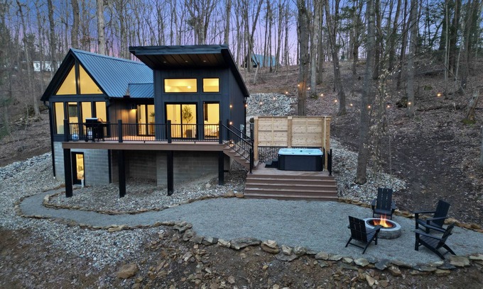 Experience Maynard's Retreat in the heart of it all! Located within our Rocky Estate properties, it is a unique stay for those looking to immerse themselves in Hocking Hills and all it has to offer! This brand new modern cabin sleeps 4 guests comfortably. Featuring luxurious amenities and furnishings. 2 private bedrooms and 2 full bathrooms each with walk in showers. Outside you can explore the property and enjoy an evening under the stars in our outdoor hot tub or sit around the cozy firepit! Must be 21 years or older to rent. Steep driveway- AWD/4WD highly recommended in all seasons.